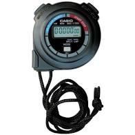 This model is configured to fit comfortably in the palm of the hand, and comes with a neck strap. Stopwatch functions include 10-hour maximum, 1/100-second timing, lap time, and split times.